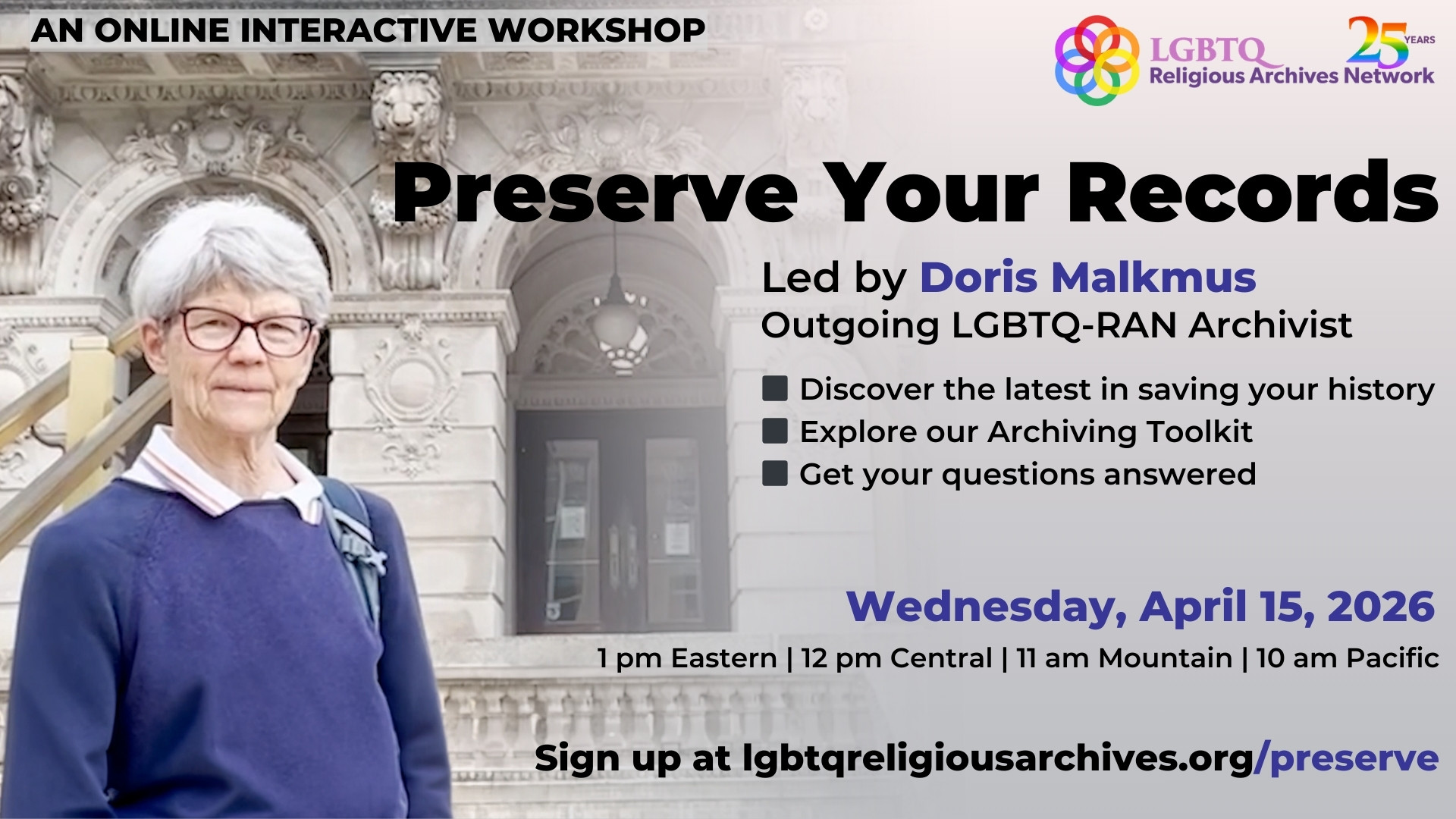 Doris announced her retirement as LGBTQ-RAN's archivist in late 2025, and this workshop will be her final one with the organization. LGBTQ-RAN is in the process of selecting a new archivist and hopes to introduce that person at this event.